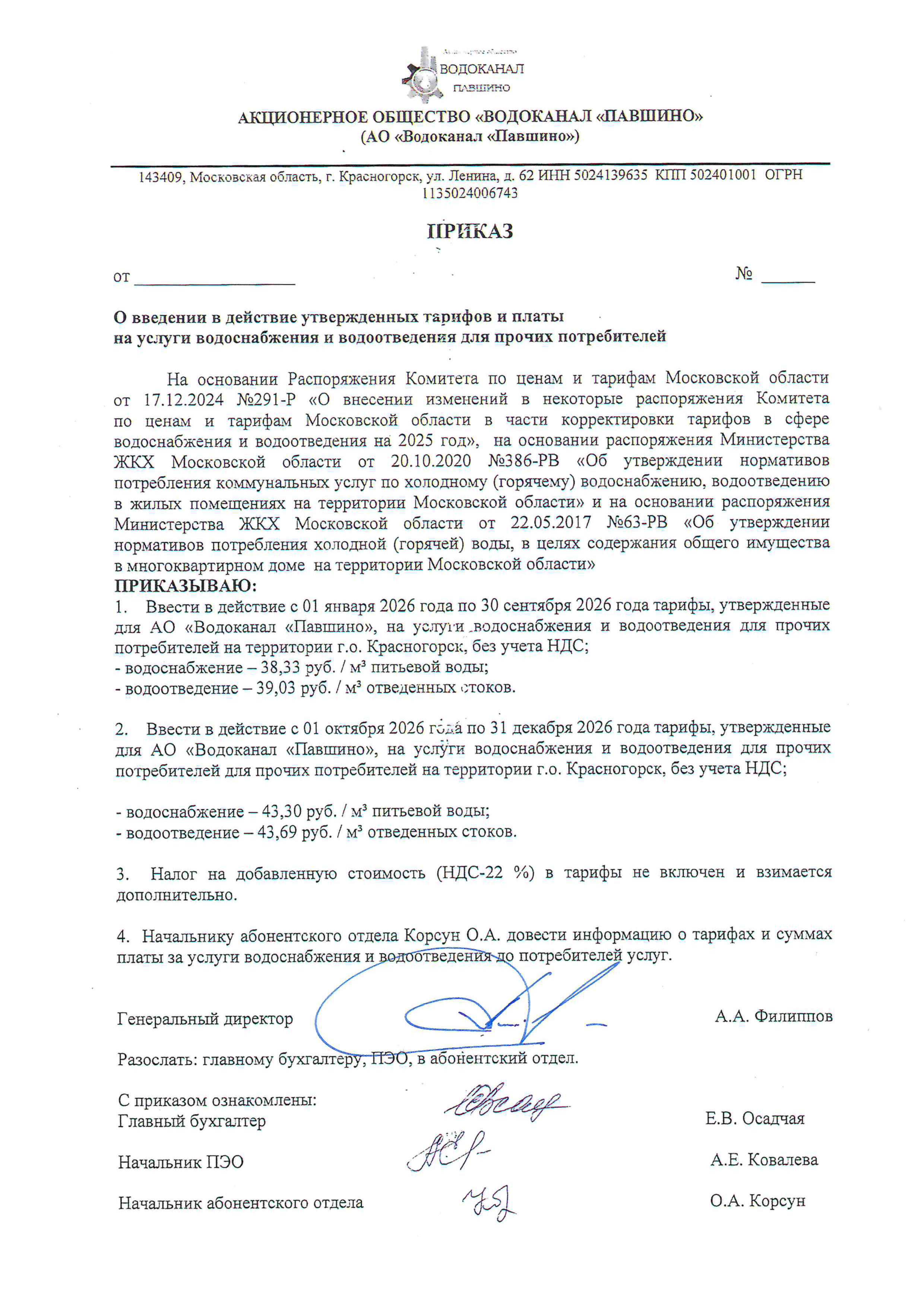 Тарифы АО «Водоканал» Павшино» с 01.01.2025 по 31.12.2025,